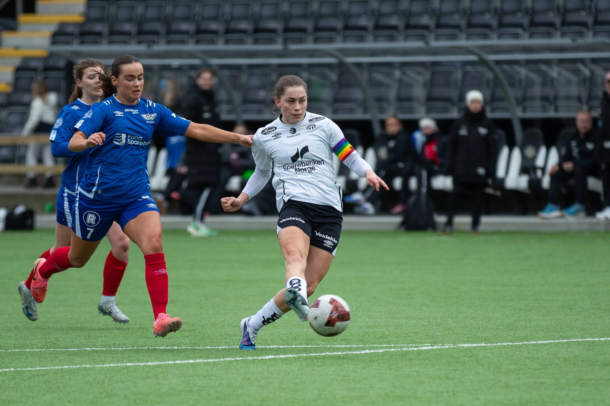 Det var lenge ein jamn kamp mellom to lag som kjempa godt i duellspelet. Ingen av dei to keeperane vart sett på dei store prøvane i byrjinga av omgangen, men etter 19 minutt var toppscoraren vår på plass. Frå eigen banehalvdel satte ho på turboen og sprang frå heile Fana-forsvaret. Heilt åleine runda ho keeper og trilla ballen kontrollert i mål til 1-0. I løpet av omgangen hadde også Fana nokre store sjansar, der Marte Aaberge si heroiske sklitakling på streken hindra at bortelaget tok leiinga. Alida Hestetun Kilen si heading i tverrliggaren kunne dobla leiinga, men det stod 1-0 til pause.